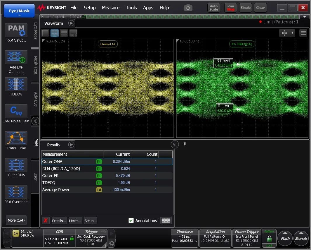 在三温情况下,发端眼图TDECQ<2dB, 收端OMA灵敏度<-8.5dBm@2E-4。